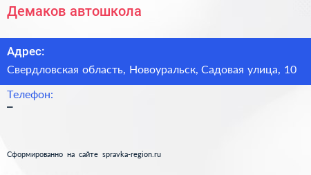 Демаков, автошкола по адресу Свердловская область, Новоуральск, Садовая улица, 10 в дальнейшем Организация, размещена в следующих категориях: