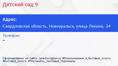 Детский сад №9 по адресу Свердловская область, Новоуральск, улица Ленина, 24 в дальнейшем Организация, размещена в следующих категориях: