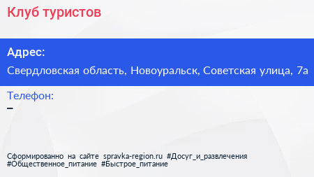 Клуб туристов по адресу Свердловская область, Новоуральск, Советская улица, 7а в дальнейшем Организация, размещена в следующих категориях: