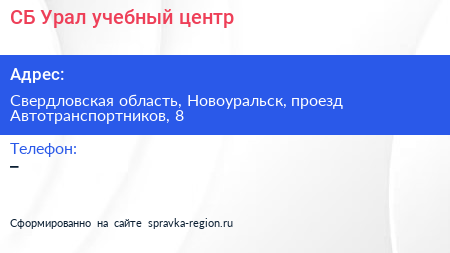 СБ-Урал, учебный центр по адресу Свердловская область, Новоуральск, проезд Автотранспортников, 8 в дальнейшем Организация, размещена в следующих категориях: