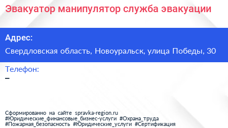 Эвакуатор-манипулятор, служба эвакуации по адресу Свердловская область, Новоуральск, улица Победы, 30 в дальнейшем Организация, размещена в следующих категориях: