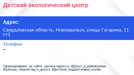 Детский экологический центр по адресу Свердловская область, Новоуральск, улица Гагарина, 11 ст1 в дальнейшем Организация, размещена в следующих категориях:
