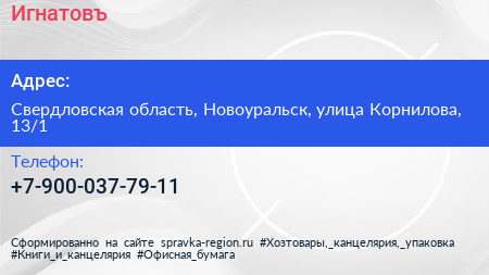 Игнатовъ по адресу Свердловская область, Новоуральск, улица Корнилова, 13/1 в дальнейшем Организация, размещена в следующих категориях: