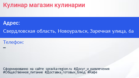 Кулинар, магазин кулинарии по адресу Свердловская область, Новоуральск, Заречная улица, 6а в дальнейшем Организация, размещена в следующих категориях: