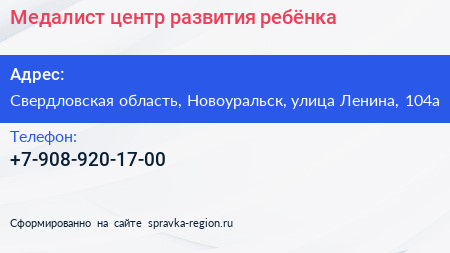 Медалист, центр развития ребёнка по адресу Свердловская область, Новоуральск, улица Ленина, 104а в дальнейшем Организация, размещена в следующих категориях: