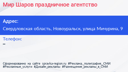 Мир Шаров, праздничное агентство по адресу Свердловская область, Новоуральск, улица Мичурина, 9 в дальнейшем Организация, размещена в следующих категориях: