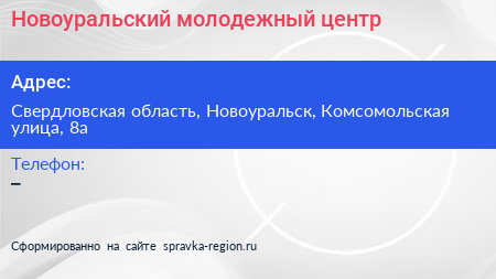 Новоуральский, молодежный центр по адресу Свердловская область, Новоуральск, Комсомольская улица, 8а в дальнейшем Организация, размещена в следующих категориях: