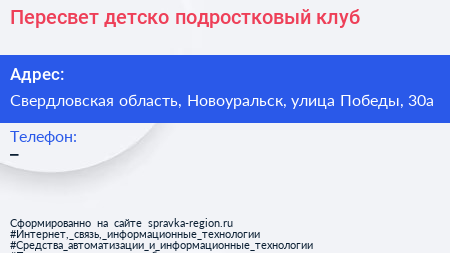 Пересвет, детско-подростковый клуб по адресу Свердловская область, Новоуральск, улица Победы, 30а в дальнейшем Организация, размещена в следующих категориях: