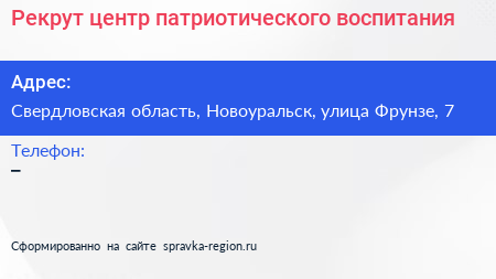 Рекрут, центр патриотического воспитания по адресу Свердловская область, Новоуральск, улица Фрунзе, 7 в дальнейшем Организация, размещена в следующих категориях: