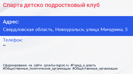 Спарта, детско-подростковый клуб по адресу Свердловская область, Новоуральск, улица Мичурина, 5 в дальнейшем Организация, размещена в следующих категориях: