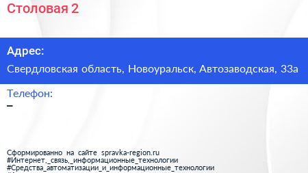 Столовая №2 по адресу Свердловская область, Новоуральск, Автозаводская, 33а в дальнейшем Организация, размещена в следующих категориях: