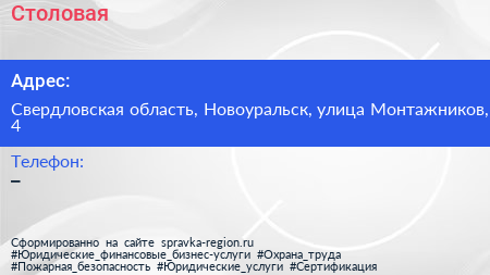Столовая по адресу Свердловская область, Новоуральск, улица Монтажников, 4 в дальнейшем Организация, размещена в следующих категориях: