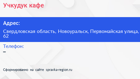 Учкудук, кафе по адресу Свердловская область, Новоуральск, Первомайская улица, 62 в дальнейшем Организация, размещена в следующих категориях: