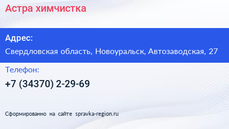 Астра, химчистка по адресу Свердловская область, Новоуральск, Автозаводская, 27 в дальнейшем Организация, размещена в следующих категориях: