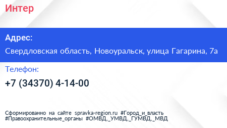 Интер по адресу Свердловская область, Новоуральск, улица Гагарина, 7а в дальнейшем Организация, размещена в следующих категориях: