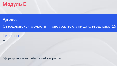 Модуль-Е по адресу Свердловская область, Новоуральск, улица Свердлова, 15 в дальнейшем Организация, размещена в следующих категориях: