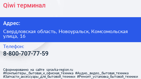 Qiwi, терминал по адресу Свердловская область, Новоуральск, Комсомольская улица, 16 в дальнейшем Организация, размещена в следующих категориях: