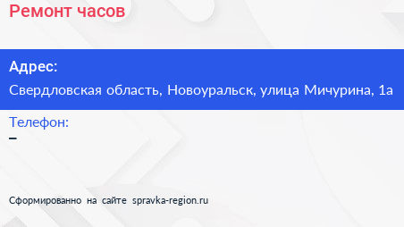 Ремонт часов по адресу Свердловская область, Новоуральск, улица Мичурина, 1а в дальнейшем Организация, размещена в следующих категориях:
