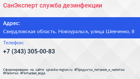 СанЭксперт, служба дезинфекции по адресу Свердловская область, Новоуральск, улица Шевченко, 8 в дальнейшем Организация, размещена в следующих категориях:
