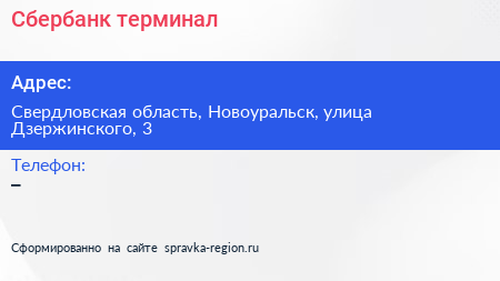 Сбербанк, терминал по адресу Свердловская область, Новоуральск, улица Дзержинского, 3 в дальнейшем Организация, размещена в следующих категориях: