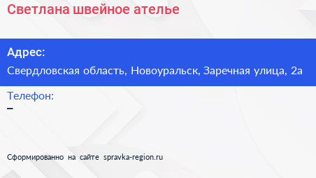 Светлана, швейное ателье по адресу Свердловская область, Новоуральск, Заречная улица, 2а в дальнейшем Организация, размещена в следующих категориях: