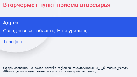 Вторчермет, пункт приема вторсырья по адресу Свердловская область, Новоуральск, в дальнейшем Организация, размещена в следующих категориях: