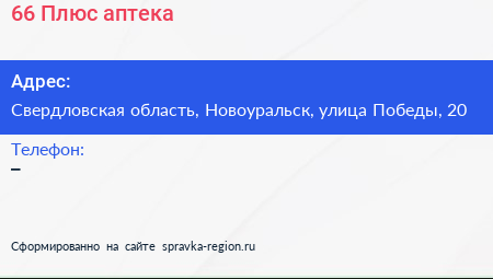 66 Плюс, аптека по адресу Свердловская область, Новоуральск, улица Победы, 20 в дальнейшем Организация, размещена в следующих категориях: