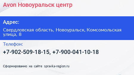 Avon-Новоуральск, центр по адресу Свердловская область, Новоуральск, Комсомольская улица, 8 в дальнейшем Организация, размещена в следующих категориях: