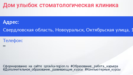 Дом улыбок, стоматологическая клиника по адресу Свердловская область, Новоуральск, Октябрьская улица, 1 в дальнейшем Организация, размещена в следующих категориях: