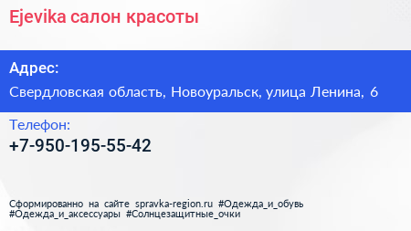 Ejevika, салон красоты по адресу Свердловская область, Новоуральск, улица Ленина, 6 в дальнейшем Организация, размещена в следующих категориях: