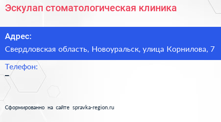 Эскулап, стоматологическая клиника по адресу Свердловская область, Новоуральск, улица Корнилова, 7 в дальнейшем Организация, размещена в следующих категориях: