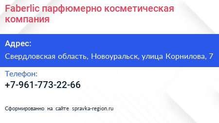 Faberlic, парфюмерно-косметическая компания по адресу Свердловская область, Новоуральск, улица Корнилова, 7 в дальнейшем Организация, размещена в следующих категориях: