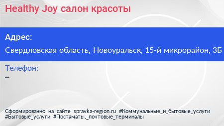Healthy Joy, салон красоты по адресу Свердловская область, Новоуральск, 15-й микрорайон, 3Б в дальнейшем Организация, размещена в следующих категориях:
