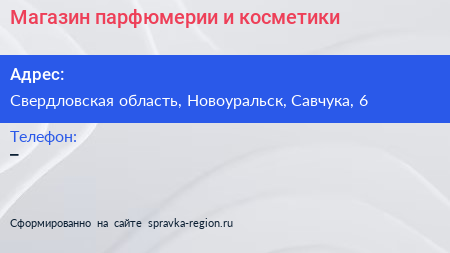 Магазин парфюмерии и косметики по адресу Свердловская область, Новоуральск, Савчука, 6 в дальнейшем Организация, размещена в следующих категориях: