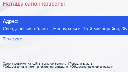 Наташа, салон красоты по адресу Свердловская область, Новоуральск, 15-й микрорайон, 3Б в дальнейшем Организация, размещена в следующих категориях: