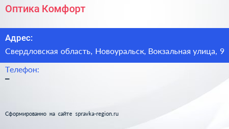 Оптика Комфорт по адресу Свердловская область, Новоуральск, Вокзальная улица, 9 в дальнейшем Организация, размещена в следующих категориях: