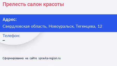 Прелесть, салон красоты по адресу Свердловская область, Новоуральск, Тегенцева, 12 в дальнейшем Организация, размещена в следующих категориях: