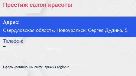 Престиж, салон красоты по адресу Свердловская область, Новоуральск, Сергея Дудина, 5 в дальнейшем Организация, размещена в следующих категориях: