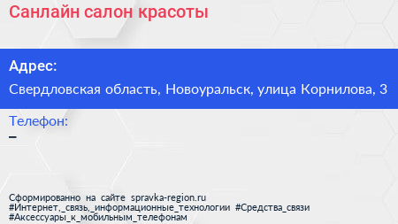 Санлайн, салон красоты по адресу Свердловская область, Новоуральск, улица Корнилова, 3 в дальнейшем Организация, размещена в следующих категориях: