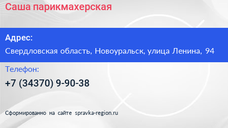Саша, парикмахерская по адресу Свердловская область, Новоуральск, улица Ленина, 94 в дальнейшем Организация, размещена в следующих категориях: