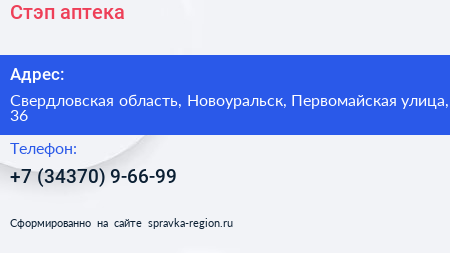 Стэп, аптека по адресу Свердловская область, Новоуральск, Первомайская улица, 36 в дальнейшем Организация, размещена в следующих категориях: