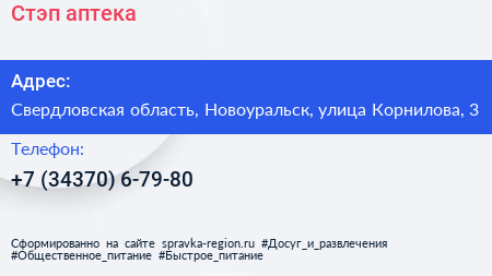 Стэп, аптека по адресу Свердловская область, Новоуральск, улица Корнилова, 3 в дальнейшем Организация, размещена в следующих категориях: