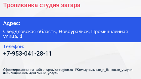 Тропиканка, студия загара по адресу Свердловская область, Новоуральск, Промышленная улица, 1 в дальнейшем Организация, размещена в следующих категориях: