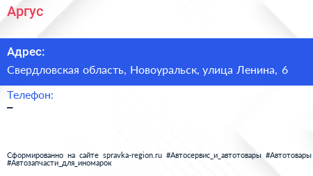 Аргус по адресу Свердловская область, Новоуральск, улица Ленина, 6 в дальнейшем Организация, размещена в следующих категориях: