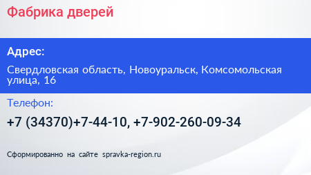 Фабрика дверей по адресу Свердловская область, Новоуральск, Комсомольская улица, 16 в дальнейшем Организация, размещена в следующих категориях: