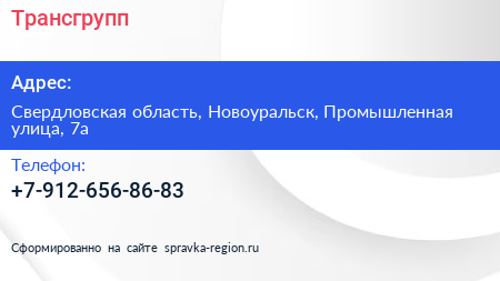 Трансгрупп по адресу Свердловская область, Новоуральск, Промышленная улица, 7а в дальнейшем Организация, размещена в следующих категориях: