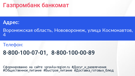 Газпромбанк, банкомат по адресу Воронежская область, Нововоронеж, улица Космонавтов, 4 в дальнейшем Организация, размещена в следующих категориях: