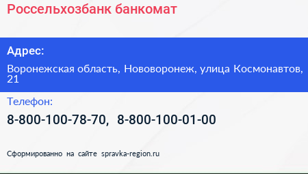 Россельхозбанк, банкомат по адресу Воронежская область, Нововоронеж, улица Космонавтов, 21 в дальнейшем Организация, размещена в следующих категориях: