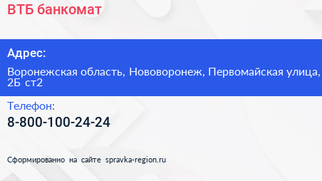ВТБ, банкомат по адресу Воронежская область, Нововоронеж, Первомайская улица, 2Б ст2 в дальнейшем Организация, размещена в следующих категориях: