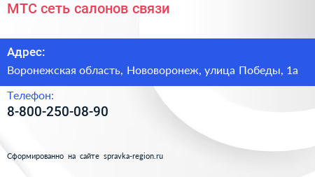 МТС, сеть салонов связи по адресу Воронежская область, Нововоронеж, улица Победы, 1а в дальнейшем Организация, размещена в следующих категориях: